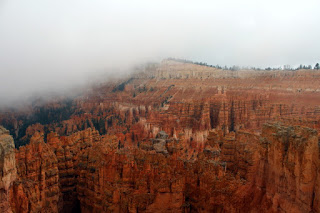 Saturday we awoke to rain and fog as we headed into Bryce Canyon National Park. Although we did not get the spectacular vistas we were able to see some of the formations through the fog at the first place we stopped. Lee and Fergal decided to hike along the rim to the next overlook while Nancy and I drove the truck to pick them up.